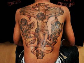 40-летний татуировщик Франк Касзебаум, который берет за свою работу 100 евро в час, рассказывает о шедевре: "Выдающаяся татуировка Налдо выглядит как изображение гигантского Иисуса на большом деревянном кресте, справа и слева от него парят 2 ангела. Один держит гитару, другой - сердце. Наверху стоит надпись на португальском языке „Livrai Nos De Todo o Mal Amem", что означает "Освободи нас от всего зла, аминь"