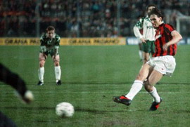 На фото: Марко ван Бастен забивает пенальти в ворота Оливера Река и приносит в своей команде победу ,а также выход в полуфинал Лиги Чемпионов-1993/94.